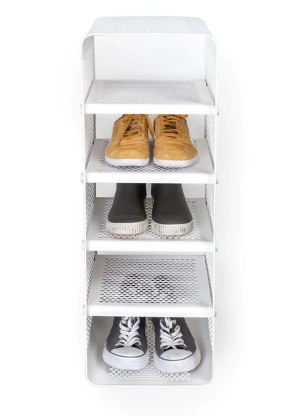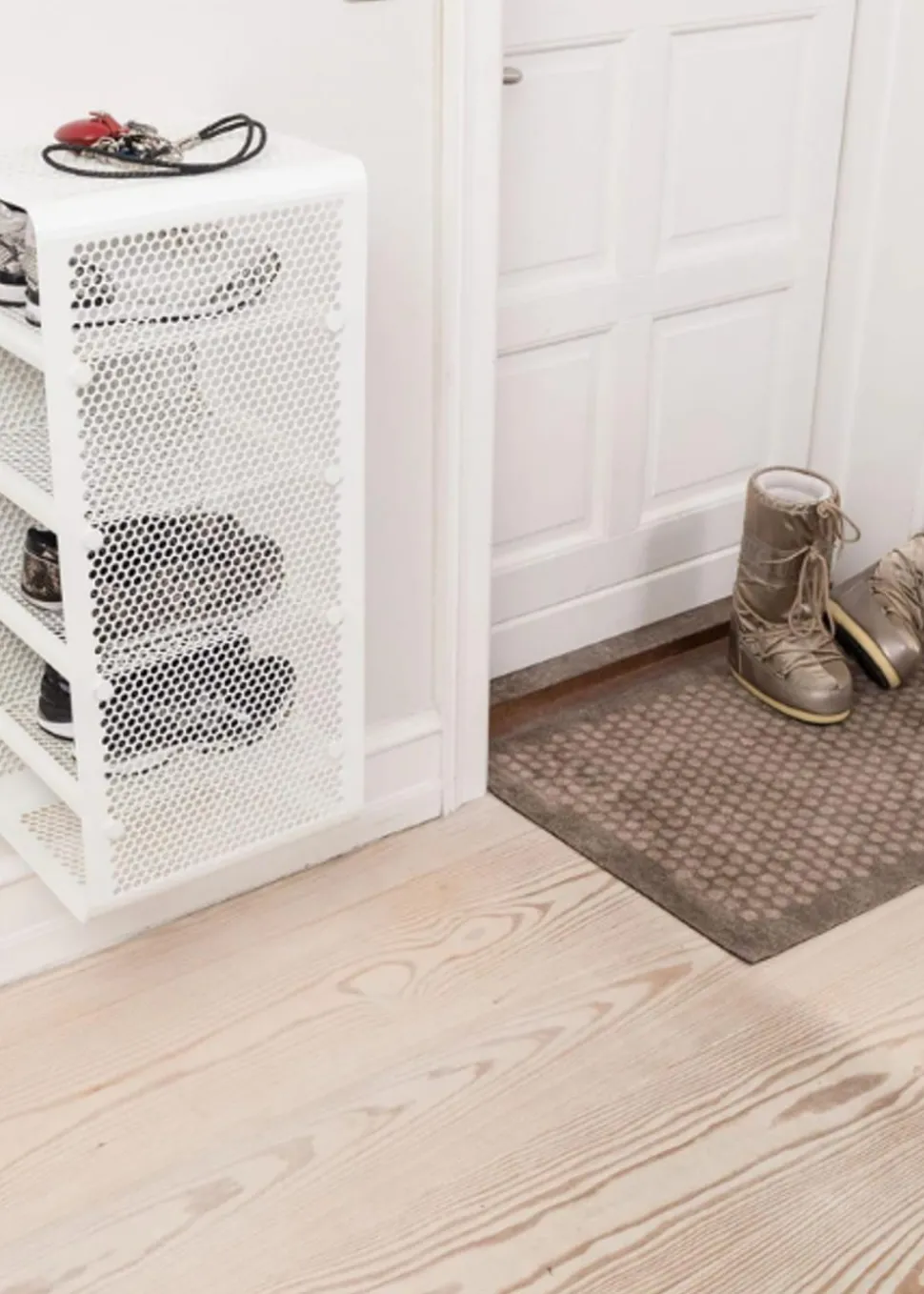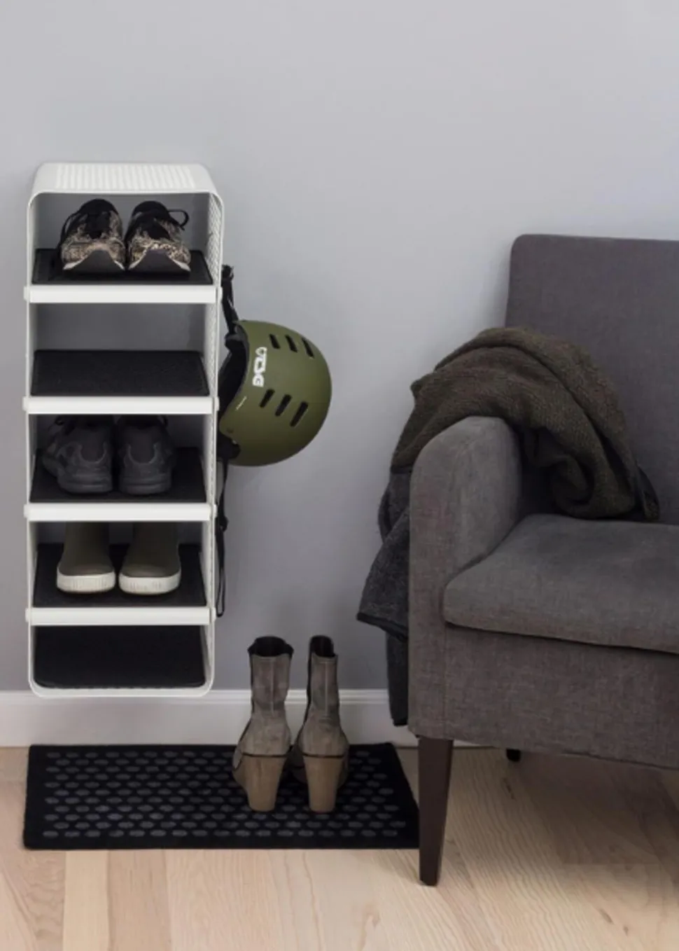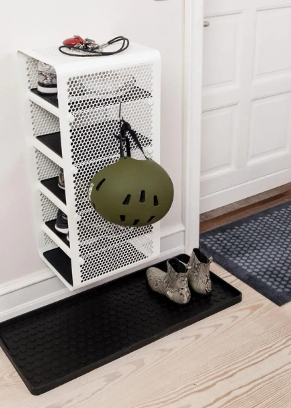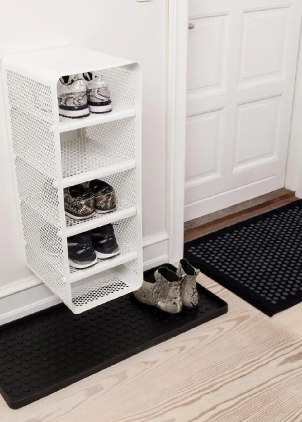 Schönes und praktisches Bücherregal. Leicht zu bewegen und perfekt für die Lagerung. Sie können die Schuhe im unteren, mittleren und oberen Regal unterbringen. Sie können aber auch Fahrradhelme, Taschen usw. oben aufbewahren. Sie können die einzigartige Matte von hinzufügen, die perfekt darunter passt, damit die Schuhe nicht auf den sauberen Boden tropfen, da die Matte den Schmutz aufnimmt. Sie können das Bücherregal auch als Nachttisch verwenden, wo Sie ein Buch, ein Handy usw. aufbewahren können. Die Wandregale können auf zwei verschiedene Arten montiert werden, nämlich entweder an der Wand mit den Regalen seitlich oder vorne, was von Vorteil sein kann, wenn man keinen so breiten Flur hat, dafür ist es perfekt.
