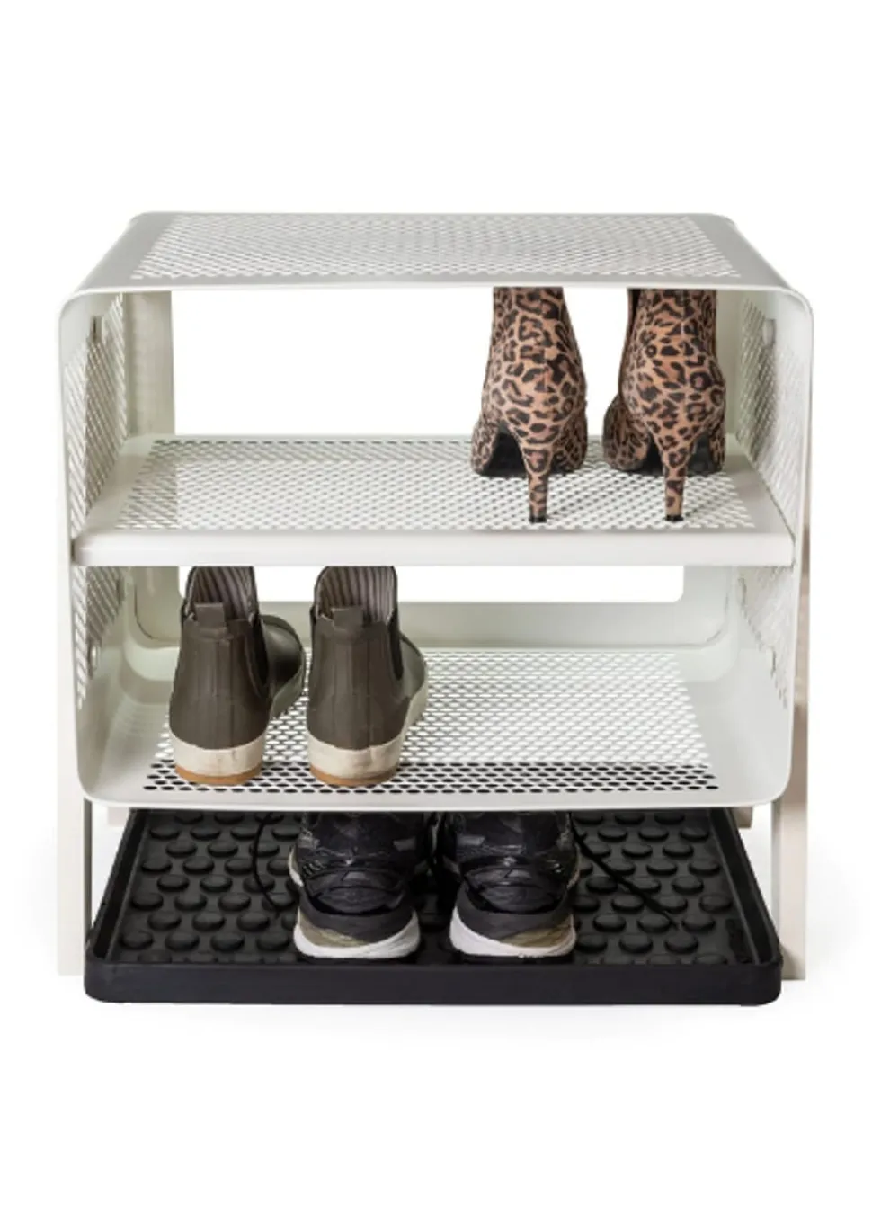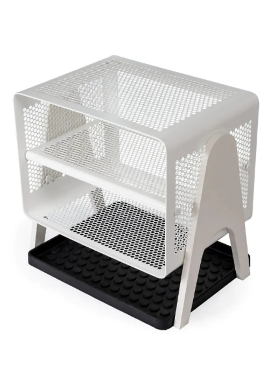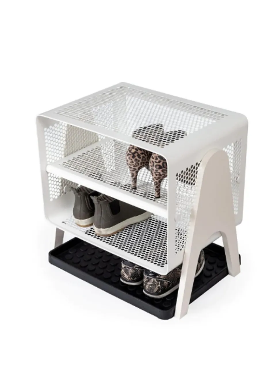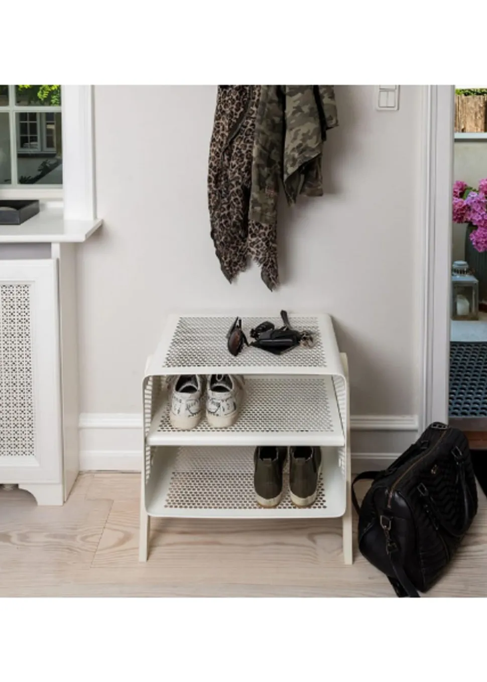 Schönes und praktisches Bücherregal. Leicht zu bewegen und perfekt für die Lagerung. Sie können die Schuhe im unteren, mittleren und oberen Regal unterbringen. Sie können aber auch Fahrradhelme, Taschen usw. oben aufbewahren. Sie können die einzigartige Matte von hinzufügen, die perfekt darunter passt, damit die Schuhe nicht auf den sauberen Boden tropfen, da die Matte den Schmutz aufnimmt. Sie können das Bücherregal auch als Nachttisch verwenden, wo Sie ein Buch, ein Handy usw. aufbewahren können. Die Wandregale können auf zwei verschiedene Arten montiert werden, nämlich entweder an der Wand mit den Regalen seitlich oder vorne, was von Vorteil sein kann, wenn man keinen so breiten Flur hat, dafür ist es perfekt.