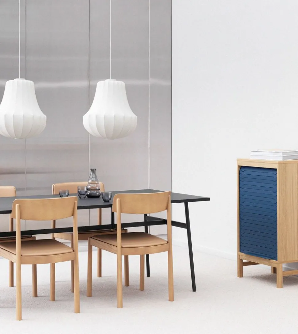 Timb Chair, entworfen von Simon Legald für , ist ein moderner Stuhl, der ein Design mit Referenzen an klassische bekannte Designs bietet. Die Proportionen des Stuhls arbeiten mit der breiten Sitzfläche und Rückenlehne, um eine bequeme Sitzgelegenheit zu schaffen, die sowohl für das Esszimmer als auch für das Büro geeignet ist.