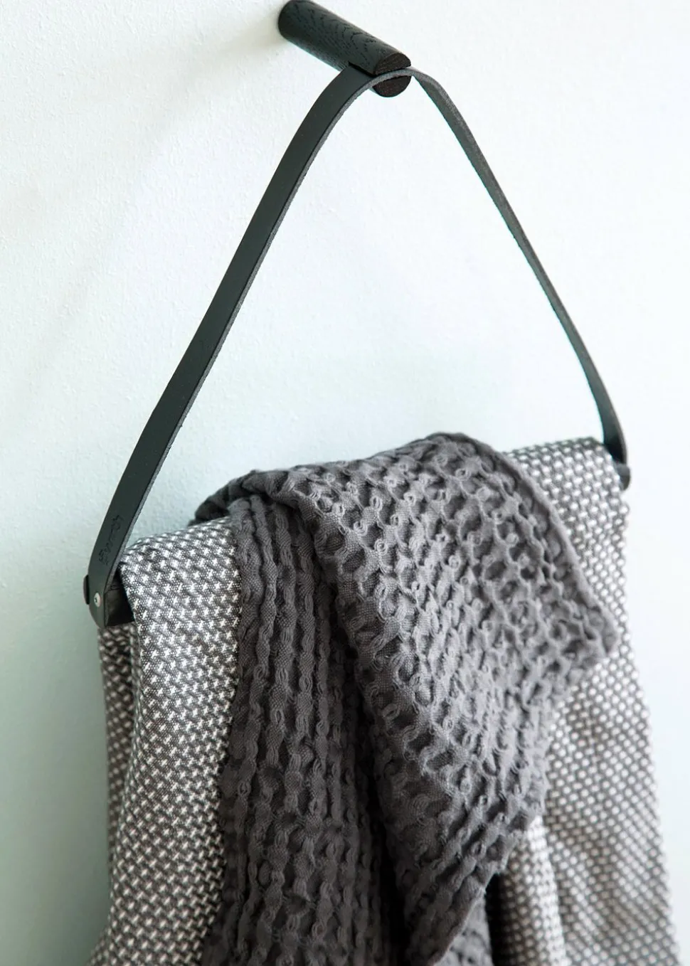 Towel Hanger ist ein schöner Handtuchhalter von . Der Handtuchhalter ist aus Leder und unterschiedlich behandeltem Eichenholz gefertigt.