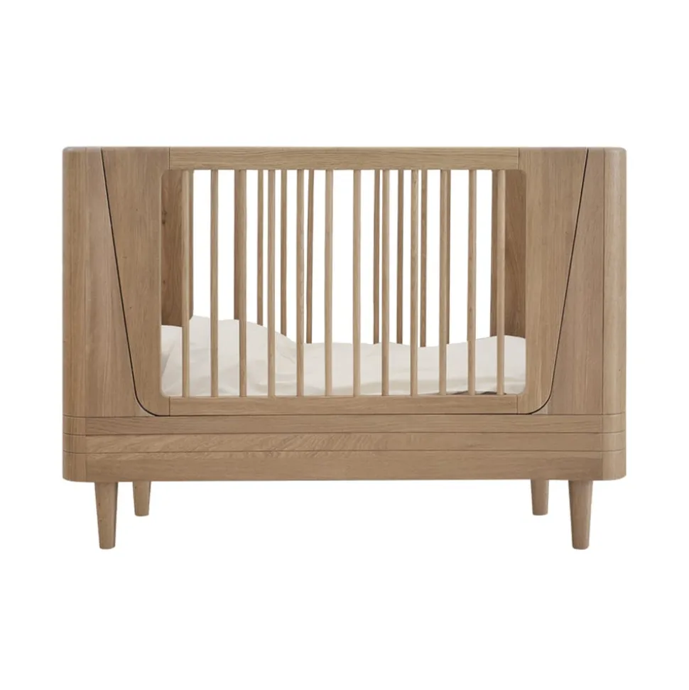 Das Kinderbett ist eine zeitlose und funktionale Wahl für das Kinderzimmer. Es ist aus massiver Eiche mit einer seidenmatten Oberfläche gefertigt. Die durchdachte Konstruktion ohne sichtbare Schrauben unterstreicht das klare, nordische Design, während die abgerundeten Kanten für eine weiche und einladende Ästhetik sorgen. Mit vier verstellbaren Stufen passt sich das Bett der Entwicklung des Kindes an, und mit einem Erweiterungsset kann es in ein Juniorbett umgewandelt werden, was eine lange Lebensdauer garantiert.