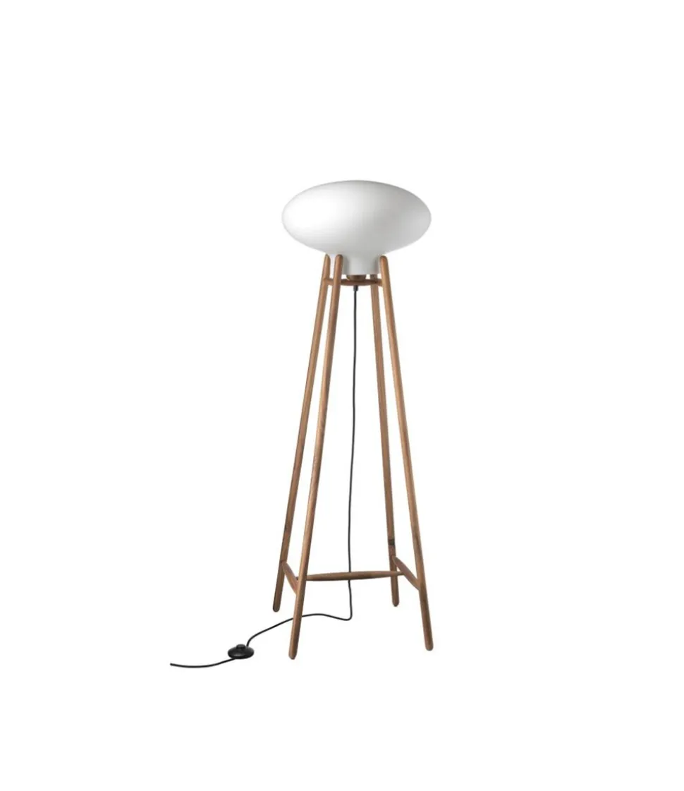 Schöne und moderne Stehleuchte von FDB Furniture. Die Hiti Lampe wurde von Philip Bro entworfen und ist die erste Lampenserie von FDM Møbler. Der Fuß ist aus Holz gedrechselt, mit einem Schirm aus mundgeblasenem Opalglas.