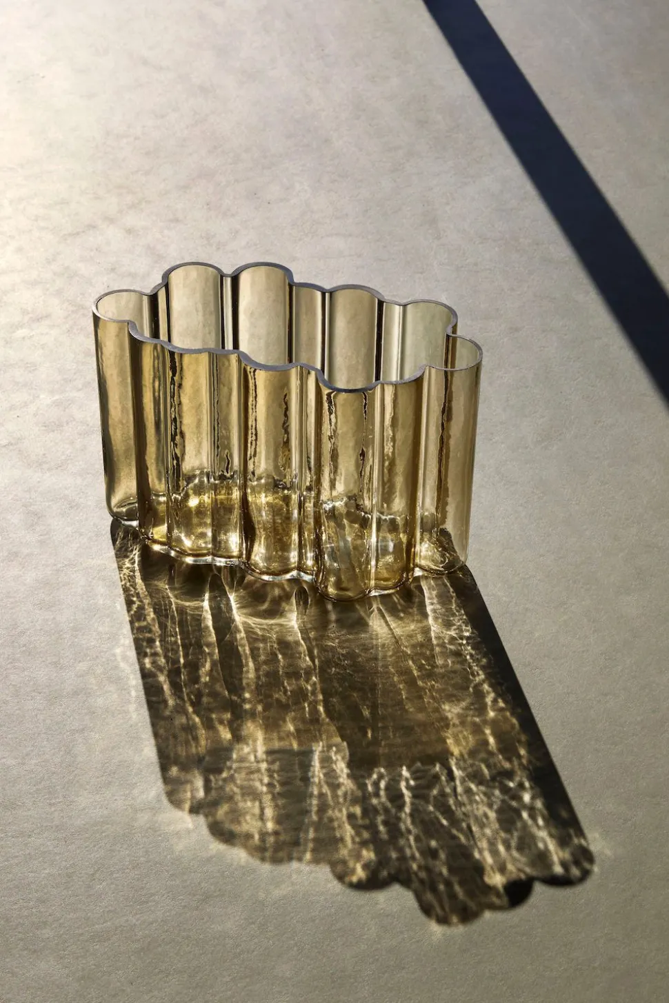Die aus feinstem Farbglas gefertigte Umber-Vase besticht durch ihre schlanke Silhouette mit anmutigen Kurven, die sich zum Hals hin sanft verjüngen und an eine schlanke Taille erinnern. Die satten, warmen Farbtöne strahlen eine faszinierende Aura aus und laden das natürliche Licht ein, bezaubernde Reflexe zu erzeugen.