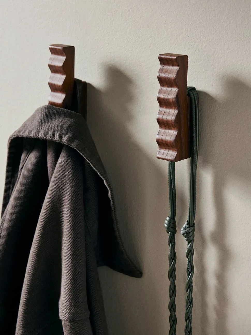 Die Haken von Unda sind aus FSC™-zertifiziertem Eschenholz gefertigt und haben ein weiches, welliges Design. Die Haken sind ein elegantes und funktionelles Detail in der Küche, im Flur, im Bad oder im Schlafzimmer.