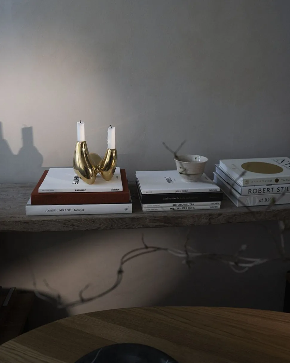 Unity Candleholder, entworfen von Rebecca Hein, ist Funktionalität und Kunst in einem Element vereint. Die einzigartige Designsprache, die weiche Kurven und skurrile Formen erforscht, bietet je nach Perspektive des Betrachters unendlich viele Ausdrucksmöglichkeiten. Das Gleichgewicht zwischen der skulpturalen Ästhetik und den funktionalen Eigenschaften ermöglicht es, den Ständer mit oder ohne Licht in der Wohnung zu platzieren. Das glänzend polierte Messing, das in zwei verschiedenen Ausführungen erhältlich ist, reflektiert die Flamme des Lichts wunderschön und erzeugt Schatten auf dem Tisch rund um den Ständer.