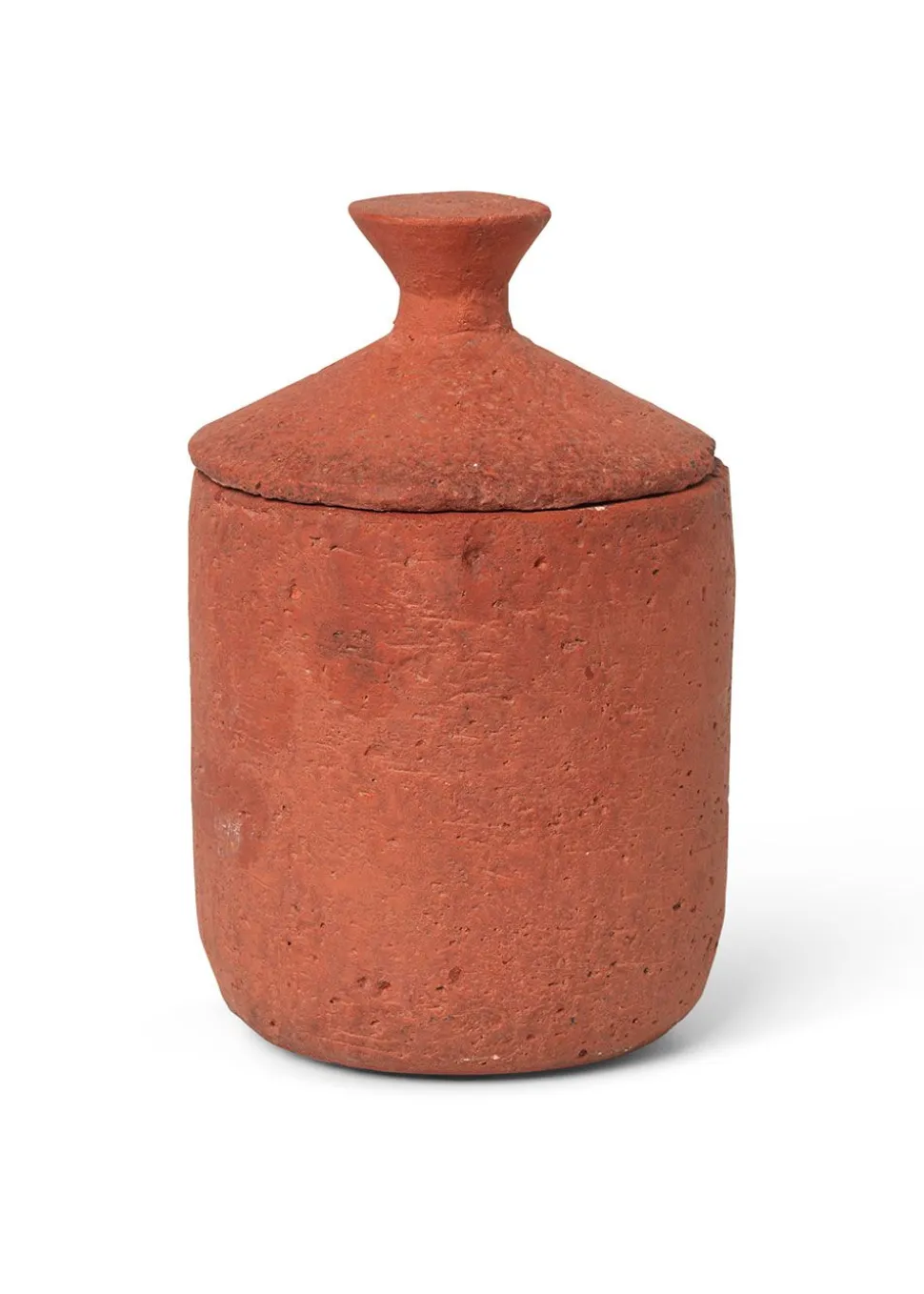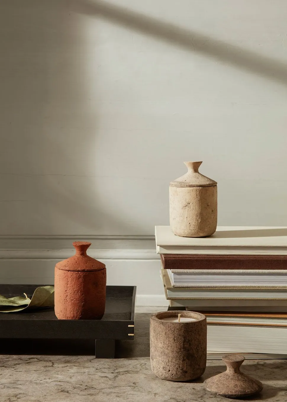 Die einzigartige Ura-Duftkerze wurde von entworfen. Das Gefäß ist aus Steingut mit dem Duft von Sojawachs hergestellt.