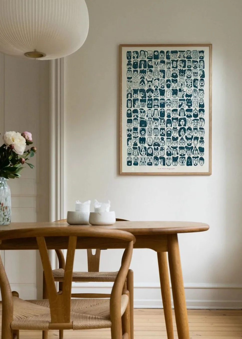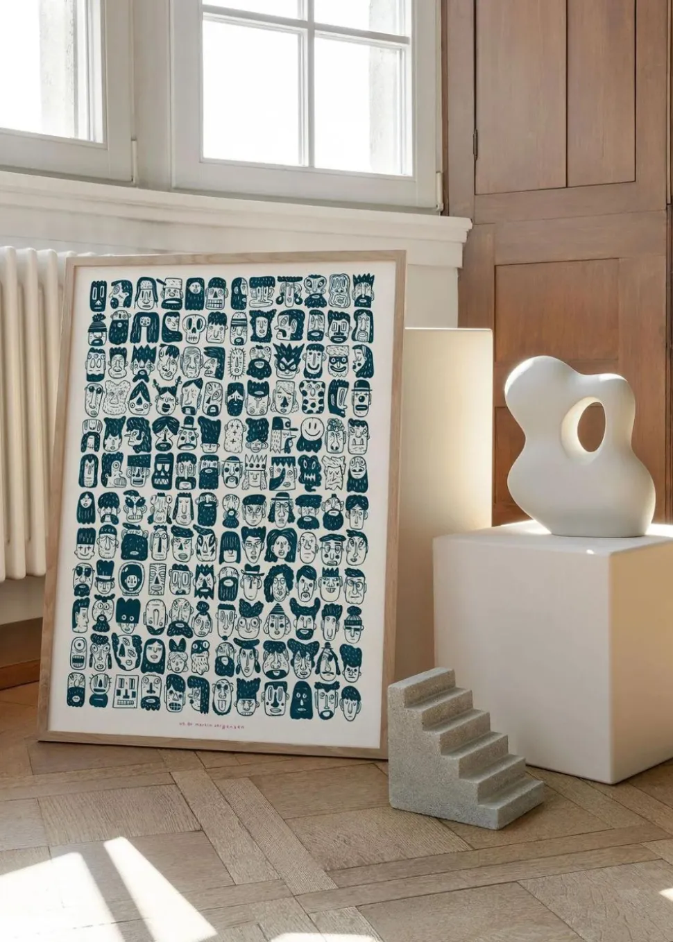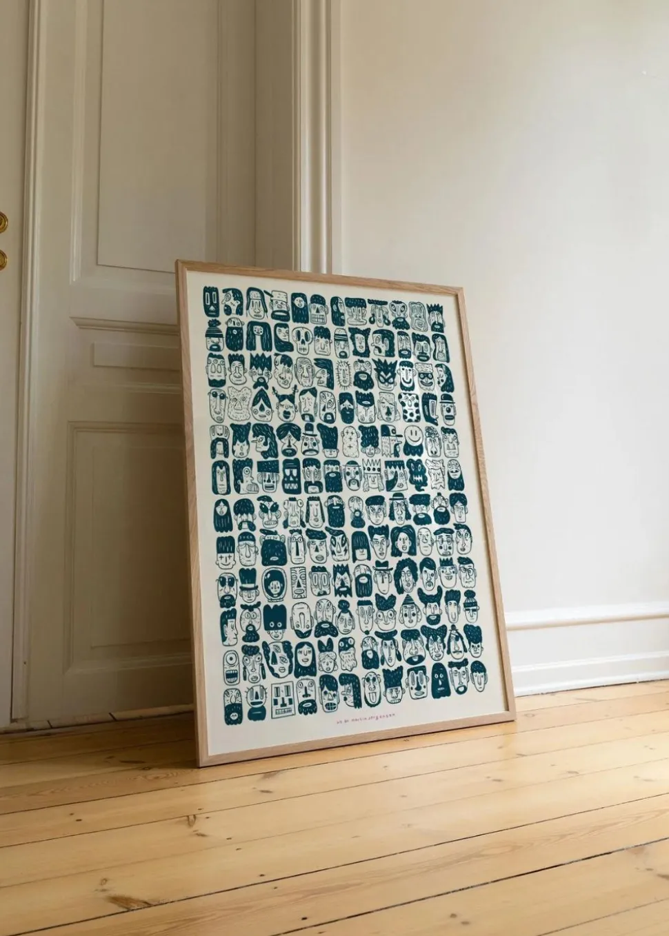 Us wurde von dem Künstler Martin Jørgensen entworfen. Das Design des Plakats ist einzigartig und lässt freie Interpretation zu. Das Motiv soll verschiedene Gesichter mit unterschiedlichen Stimmungen darstellen. Die schöne grüne Farbe trägt dazu bei, Ruhe und Ausgeglichenheit zu schaffen.