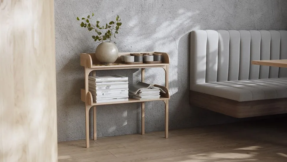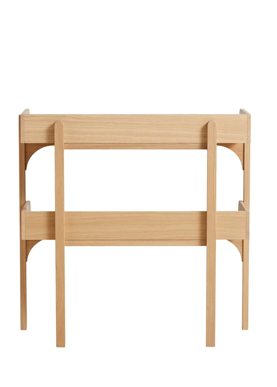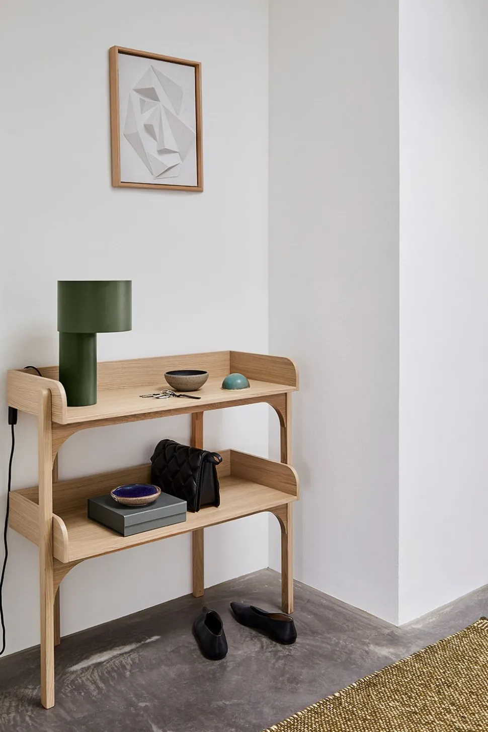 Das von Rachael Heritage für entworfeneUtility Shelf kombiniert die Funktionalität eines Bücherregals mit der Formensprache eines offenen Regals. Weiche Rundungen und ausgeprägte Maserungen im Holz verleihen dem Regal ein organisches und warmes Aussehen, das sich sowohl in das Wohnzimmer als auch in die Eingangshalle integrieren lässt. Hier können Sie Bücher und Zeitschriften oder Hüte, Schlüssel und Taschen griffbereit aufbewahren.
