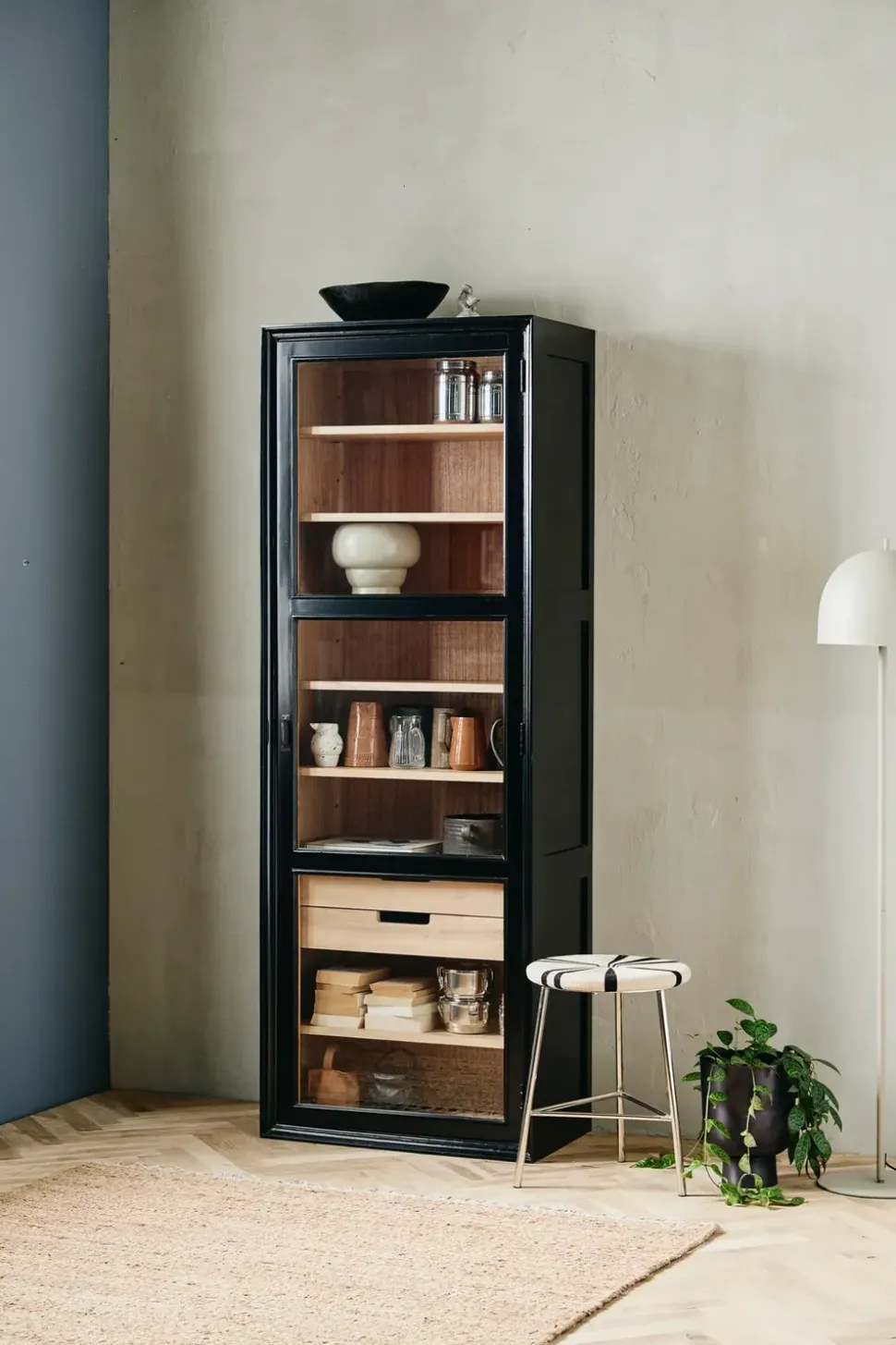 Die Vitrine VIVA von verbindet moderne Eleganz mit klassischer Finesse. Mit einem schwarz lackierten Korpus und einer Verkleidung aus Holzfurnier bildet die Vitrine einen warmen Kontrast zu den schlichten Glastüren. Die schlichte schwarze Kante umrahmt Ihre Lieblingsstücke mit raffinierter Präzision, während die verstellbaren Einlegeböden jeder Sammlung Flexibilität verleihen.