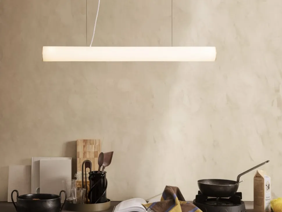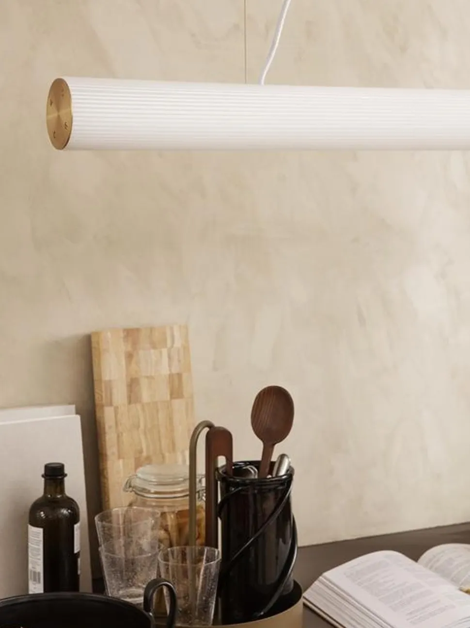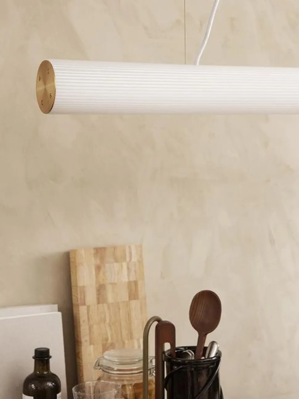Einzigartige und ästhetische Pendelleuchte aus weißem Opalglas mit feinen Details aus Messing oder Stahl von . Das einzigartige Design der Leuchte ist von antiken Säulen inspiriert, die mit ihrer gerillten Oberfläche zusammen mit dem Opalglas ein weiches, diffuses Licht erzeugt, das perfekt über den Esstisch in der Küche oder im Büro passt.