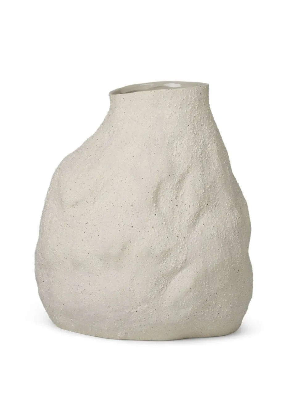 Die Vase Valca wird aus Steinzeug hergestellt, das von der unebenen Oberfläche der Vulkansteine inspiriert ist. Die cremefarbene Glasur ist mit kleinen Steinkörnern gefüllt, die der Vase eine raue, matte Textur verleihen und einen organischen Ausdruck erzeugen, der charakteristisch für die Designs von ist. Die Vase kann mit Blumen oder Glaselementen kombiniert werden, um einen Kontrast aus Eleganz und Rustikalität zu schaffen.