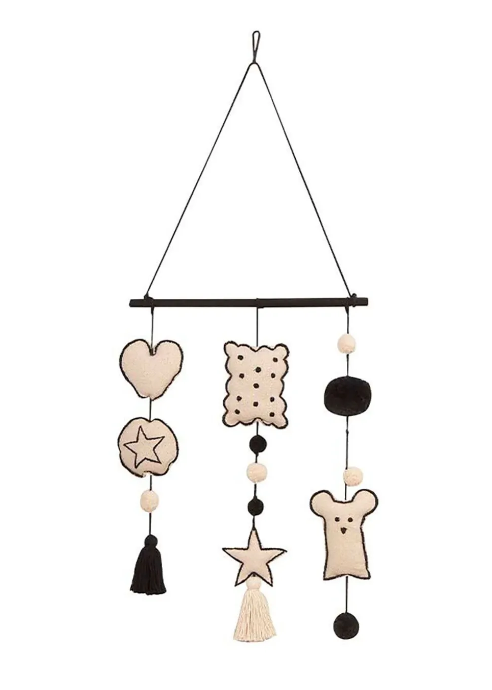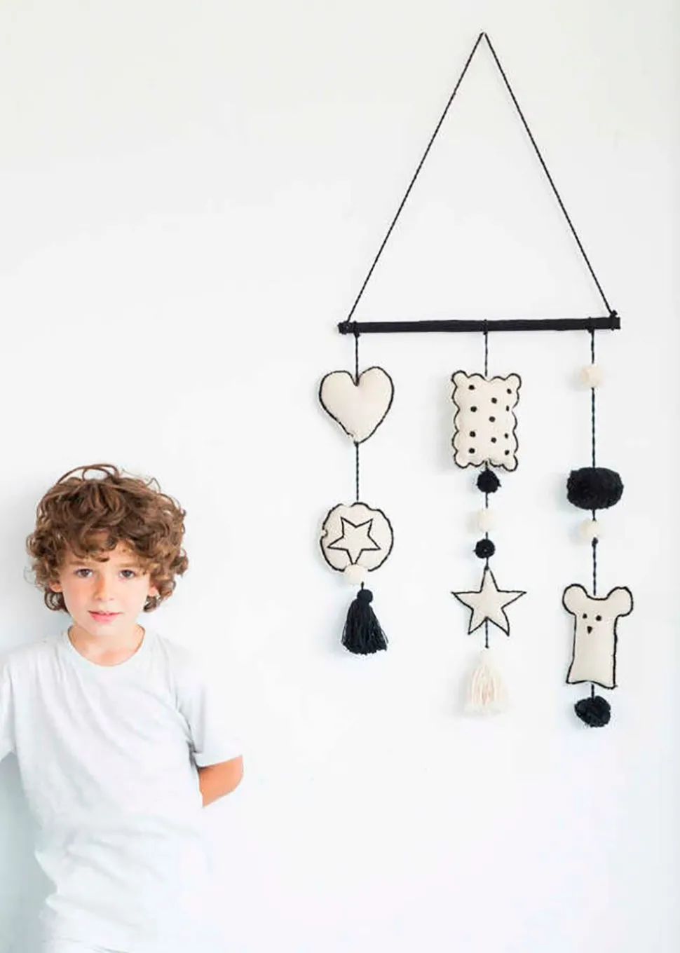 Der Wandbehang Baby von ist ein toller Wandbehang für das Kinderzimmer. Der Wandbehang ist eine einzigartige und lustige Art zu dekorieren. Mit seinen schwarzen und naturfarbenen Minikissen, die an einem baumwollüberzogenen Kunststoffschlauch befestigt sind, bringt dieser Wandbehang ein lustiges und verspieltes Element in jedes Kinderzimmer.