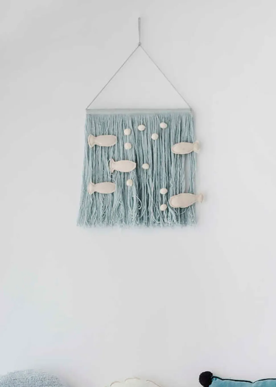 Der Wandbehang Ozean von ist eine schöne und fantasievolle Wanddekoration für Kinder. Die Dekoration ist eine gefranste Oase in Blautönen mit naturfarbenen Fischsilhouetten und Baumwollblasen, die an einem baumwollummantelten Kunststoffrohr befestigt sind. Sie ist perfekt, um jedem Kinderzimmer einen maritimen Touch zu verleihen. Die Dekoration ist Teil der Serie The Sea.