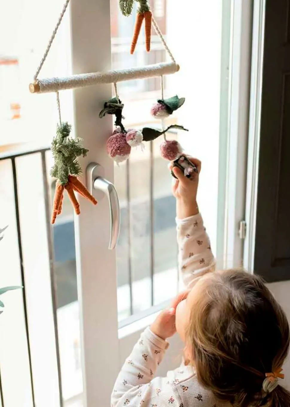 Die Karotten und Radieschen hängen an einem mit Schnüren bespannten Holzständer, der leicht und einfach an die Wand gehängt werden kann. Verwenden Sie den Wandbehang im Kinderzimmer und fügen Sie einen Hauch des Gemüsethemas hinzu, das sicher lustig und lehrreich anzusehen ist.