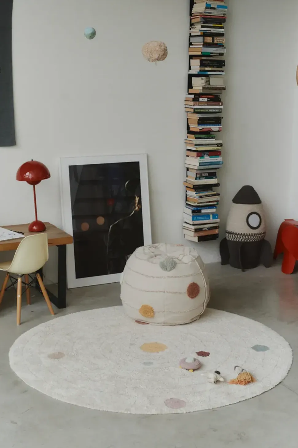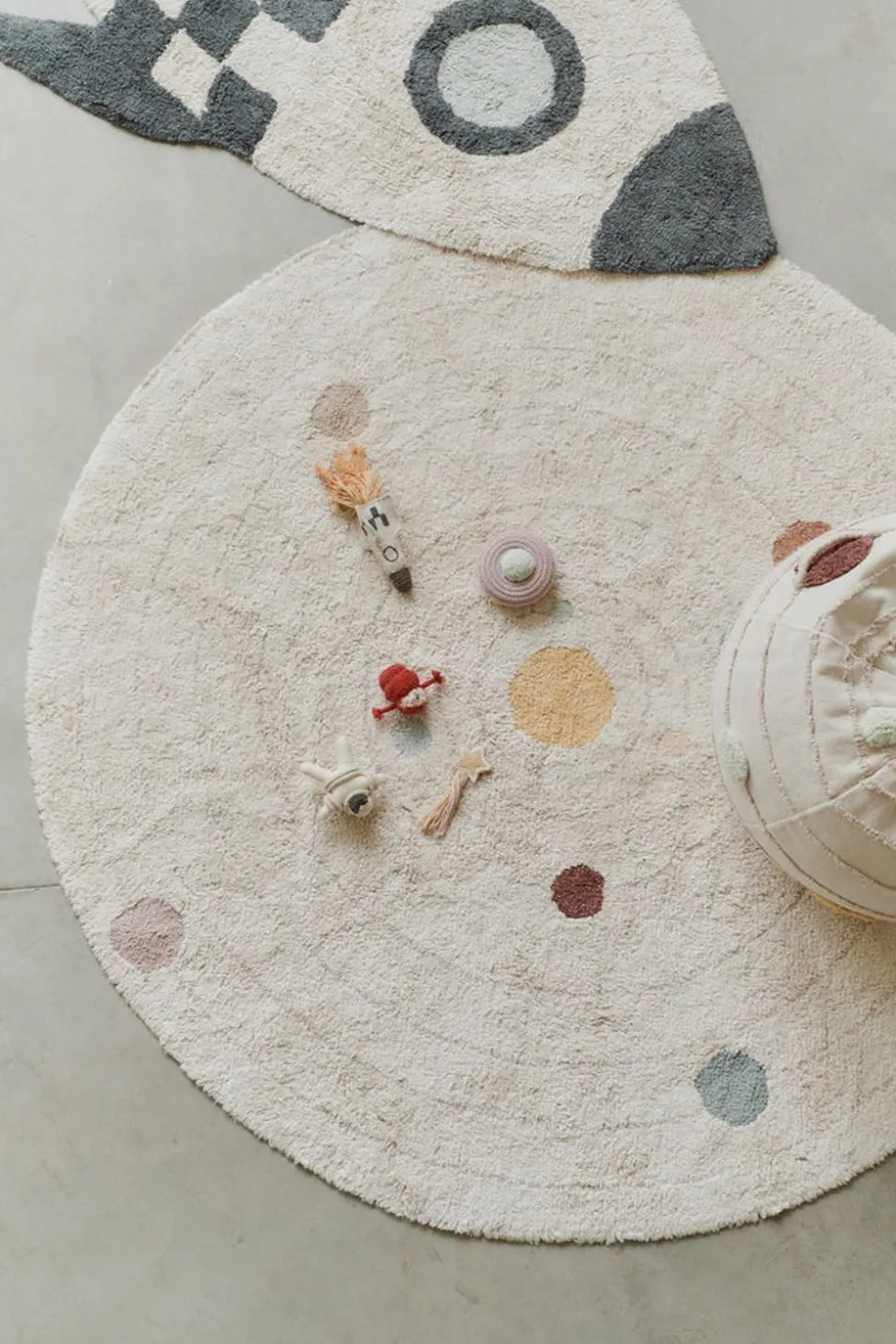 Der waschbare Spielteppich SOLAR SYSTEM von lädt Ihr Kind auf eine abenteuerliche Reise durch den Weltraum ein! Der aus weicher Baumwolle handgefertigte Spielteppich zeigt das Sonnensystem mit seinen wunderschönen Planeten und Sternen. Die zarten und doch leuchtenden Farben schaffen eine Welt der Neugier und Entdeckung, in der Ihr Kind träumen und die Wunder des Universums kennen lernen kann. Bei der Herstellung der Decke wurde auf die Sicherheit der Kinder geachtet. Sie enthält keine schädlichen Chemikalien und ist so strapazierfähig, dass sie selbst den aktivsten kleinen Astronauten gerecht wird.