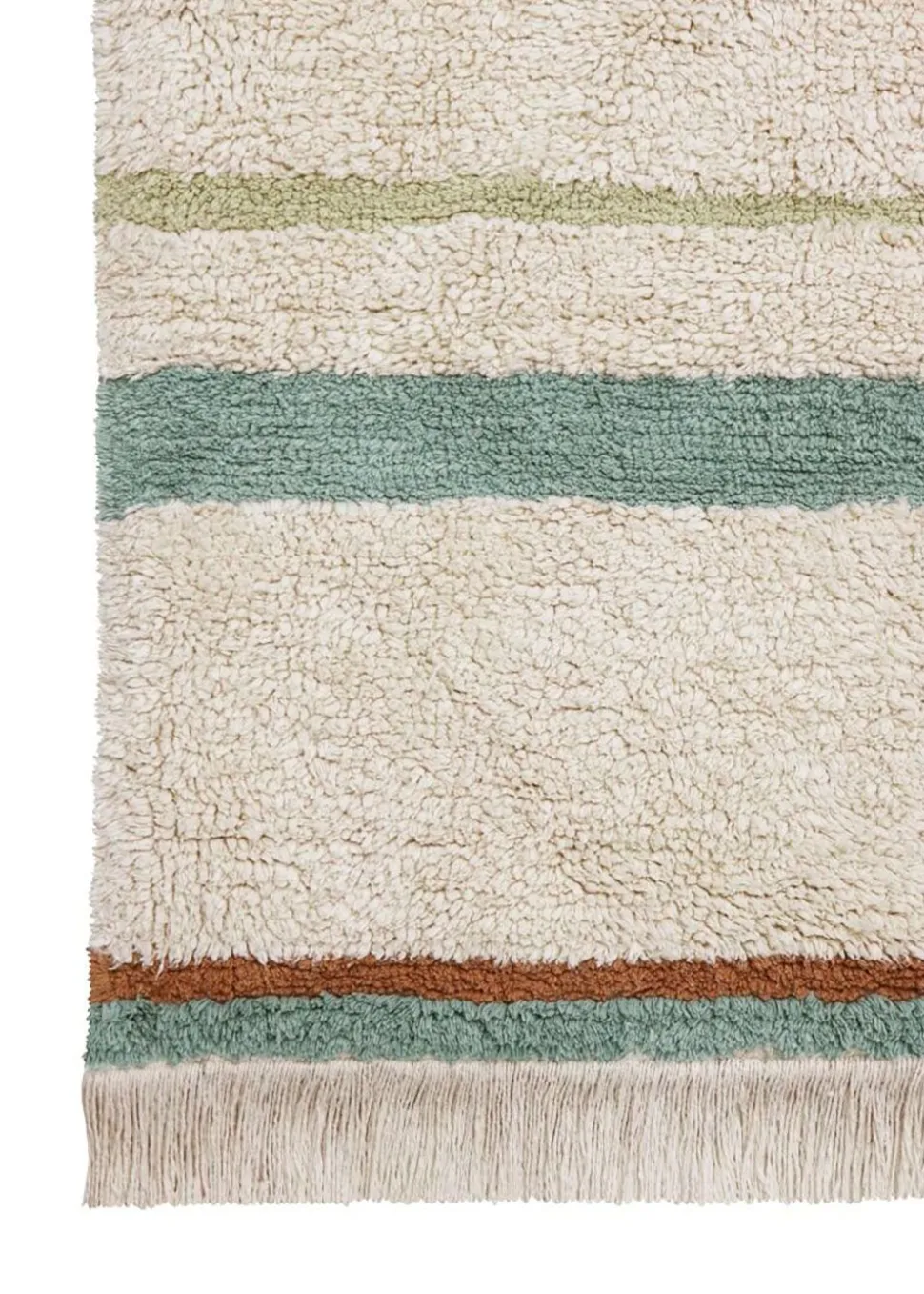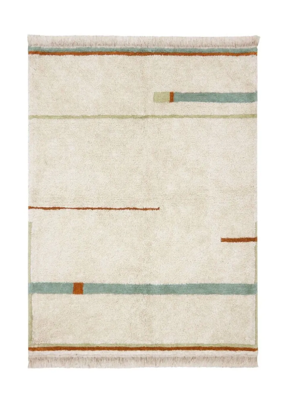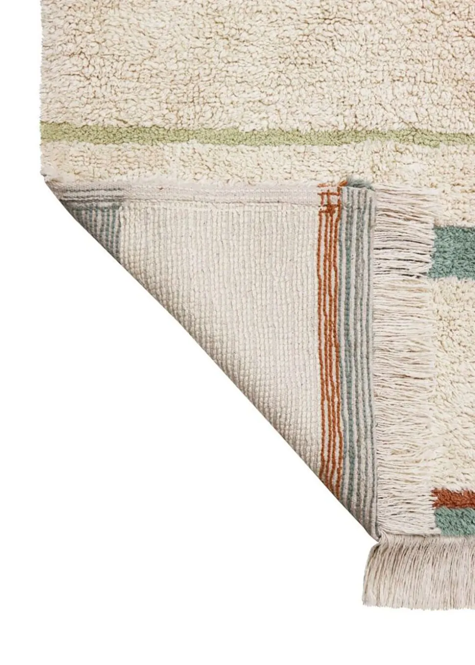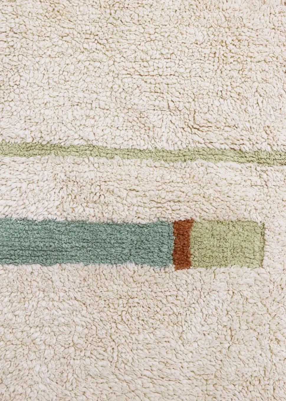 - Material Der Teppich besteht aus 97% Baumwolle und 3% anderen Fasern. Die Rückseite des Teppichs ist aus recycelten Textilfasern hergestellt.