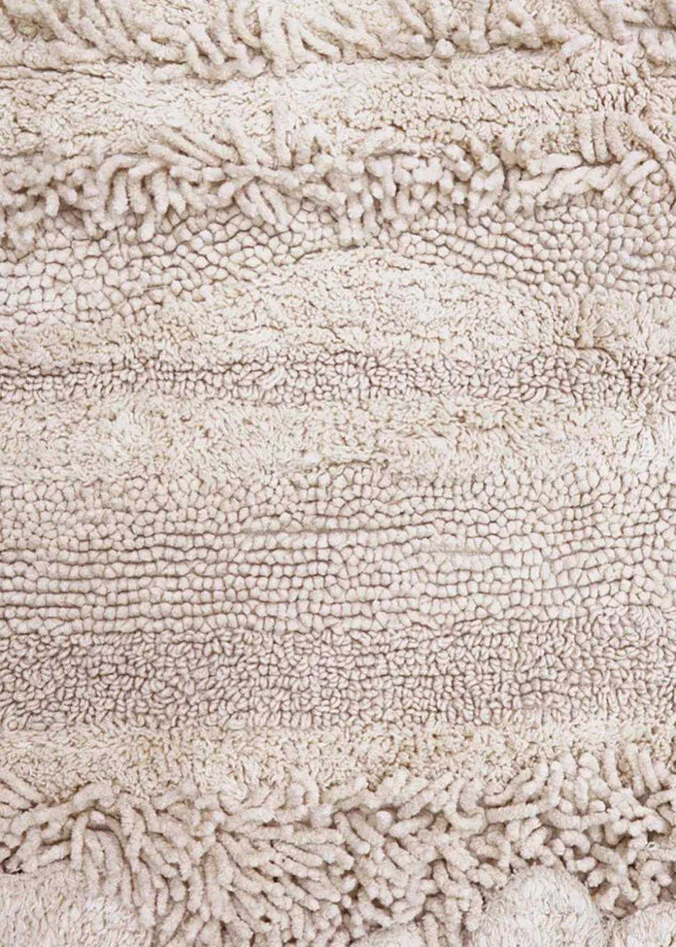 Der Teppich hat ein stilvolles Aussehen. Das unifarbene Design aus cremefarbener Baumwolle wird mit verschiedenen Nähtechniken kombiniert, wie z. B. Cut Bun, Loop und Chennille. Das alles verleiht dem Teppich ein wunderschönes Finish. Legen Sie den Teppich in das Zimmer Ihres Kindes und erleben Sie, wie er eine ruhige und fröhliche Atmosphäre schafft.