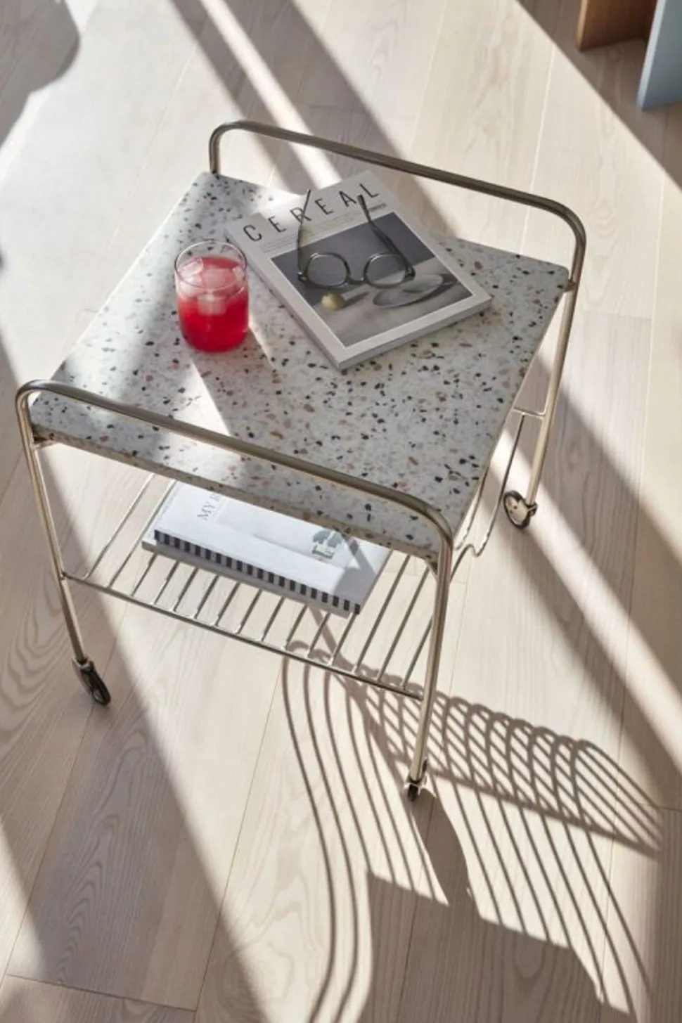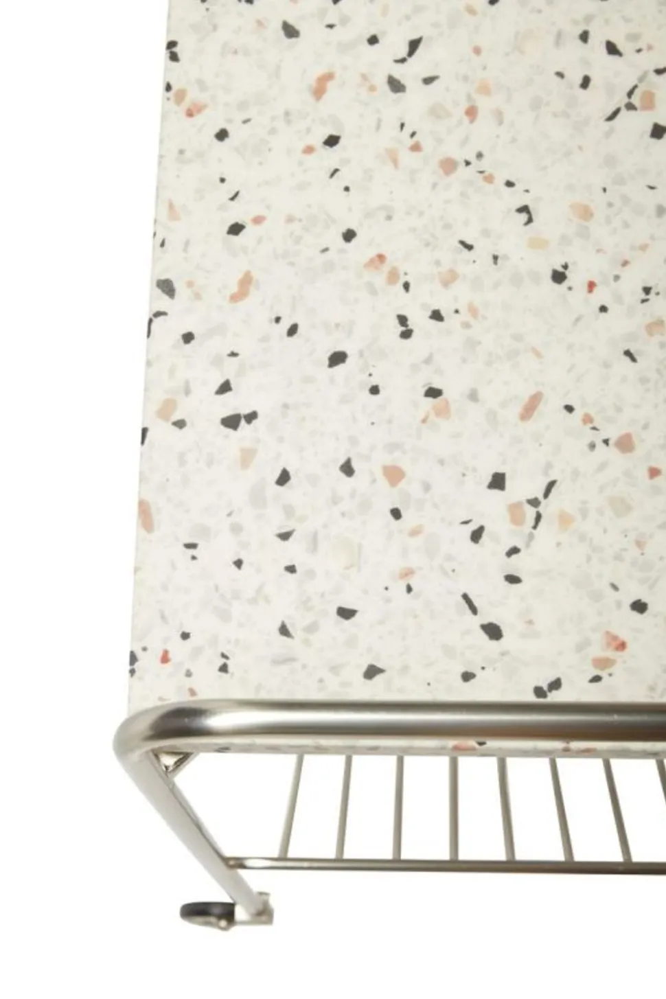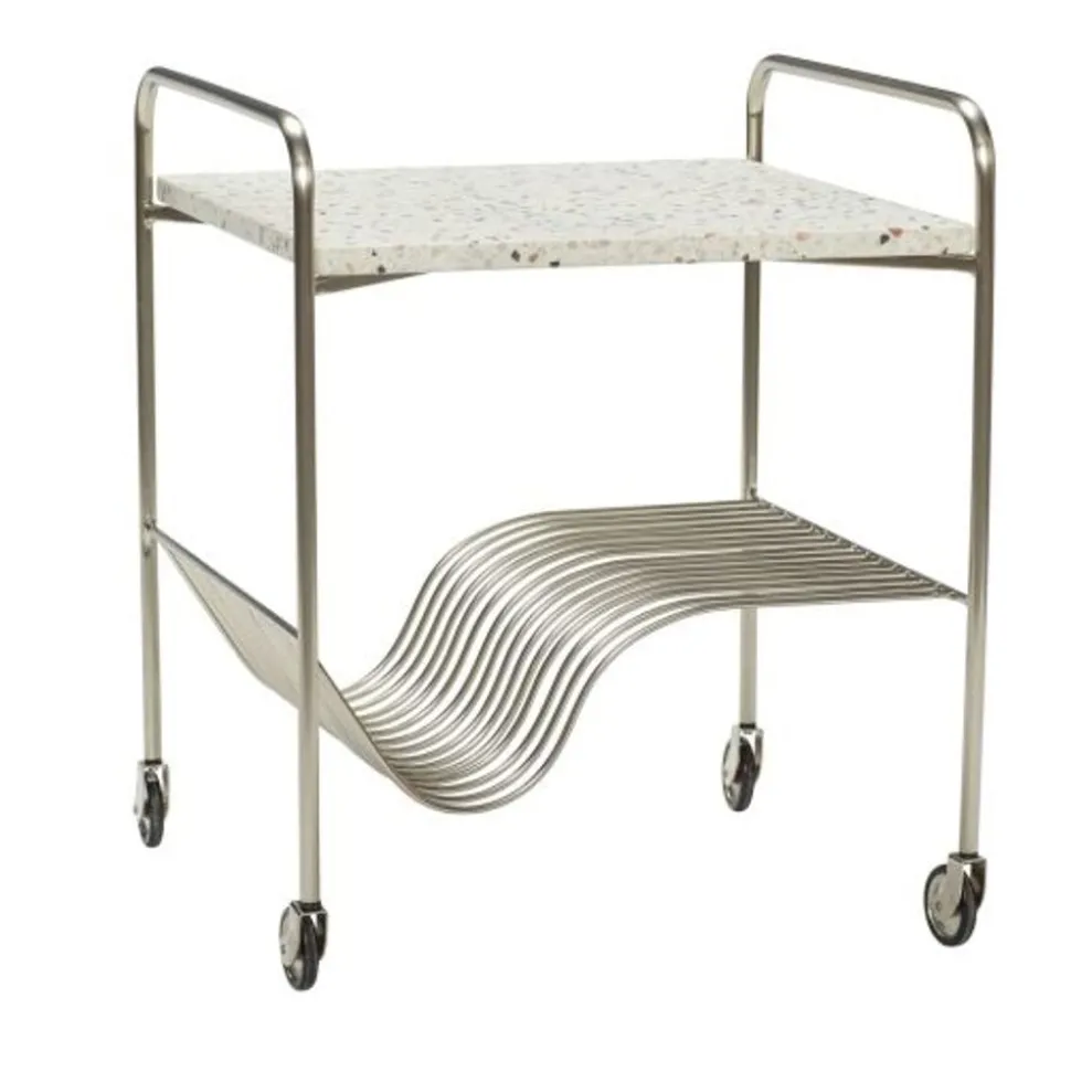 Schöner, einzigartiger Rolltisch von . Passt perfekt ins Wohnzimmer, Schlafzimmer oder Büro. Wave Trolley hat einen Rahmen aus Eisen und eine schöne Tischplatte aus Terrazzo.
