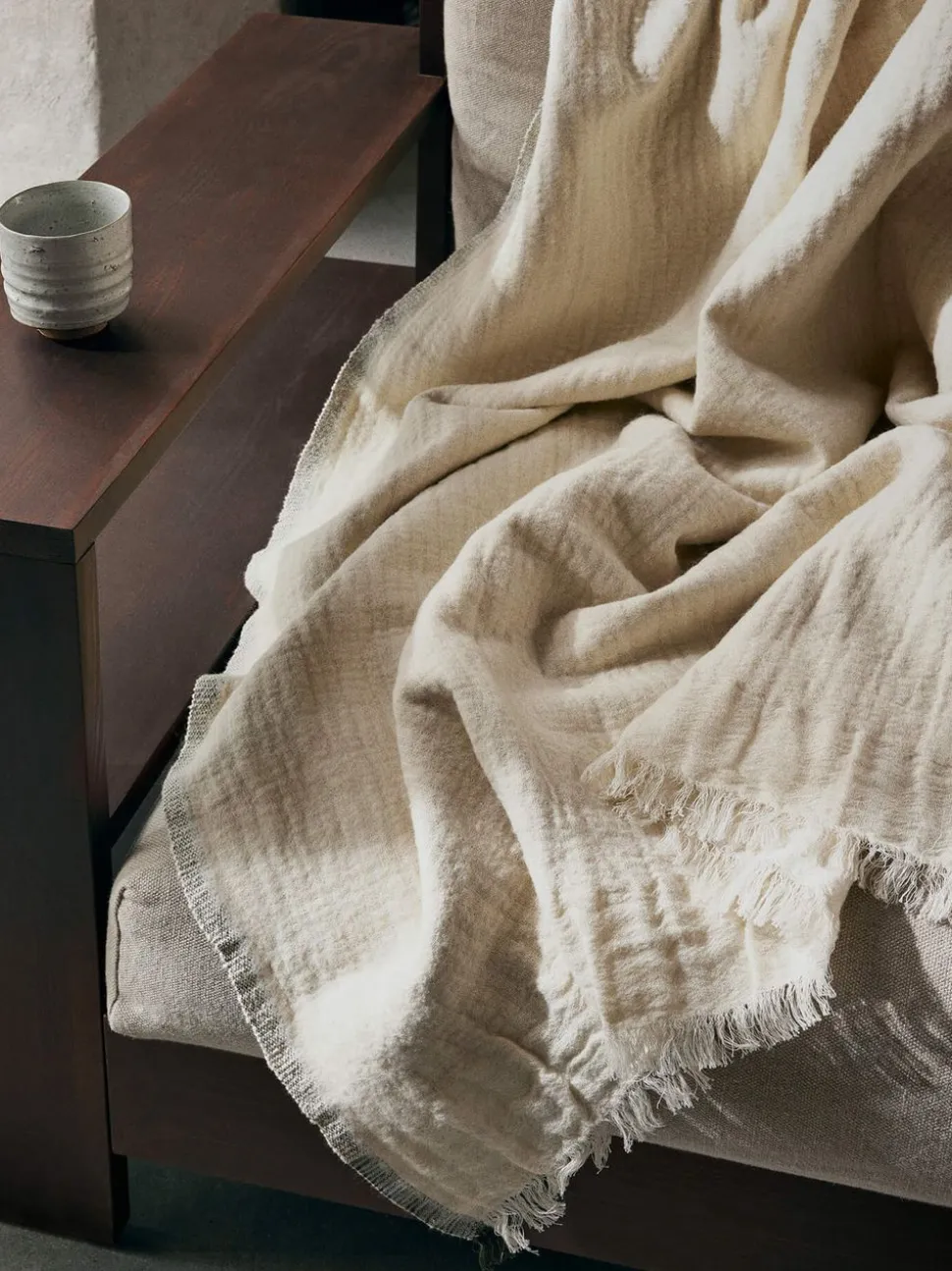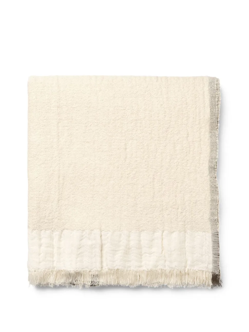 Das aus einer Mischung aus Leinen, Wolle und Baumwolle handgewebte Weaver Throw hat eine kunstvoll unregelmäßige Oberfläche und einen zarten Rand, der mit feinen Fransen verziert ist. Ob über dem Sofa drapiert, um Ruhe zu finden, oder elegant als Tagesdecke über dem Bett ausgebreitet, das Weaver Throw verleiht jeder Umgebung einen Hauch von Raffinesse.