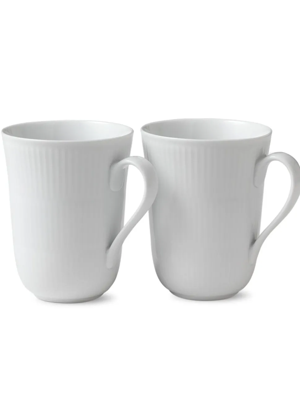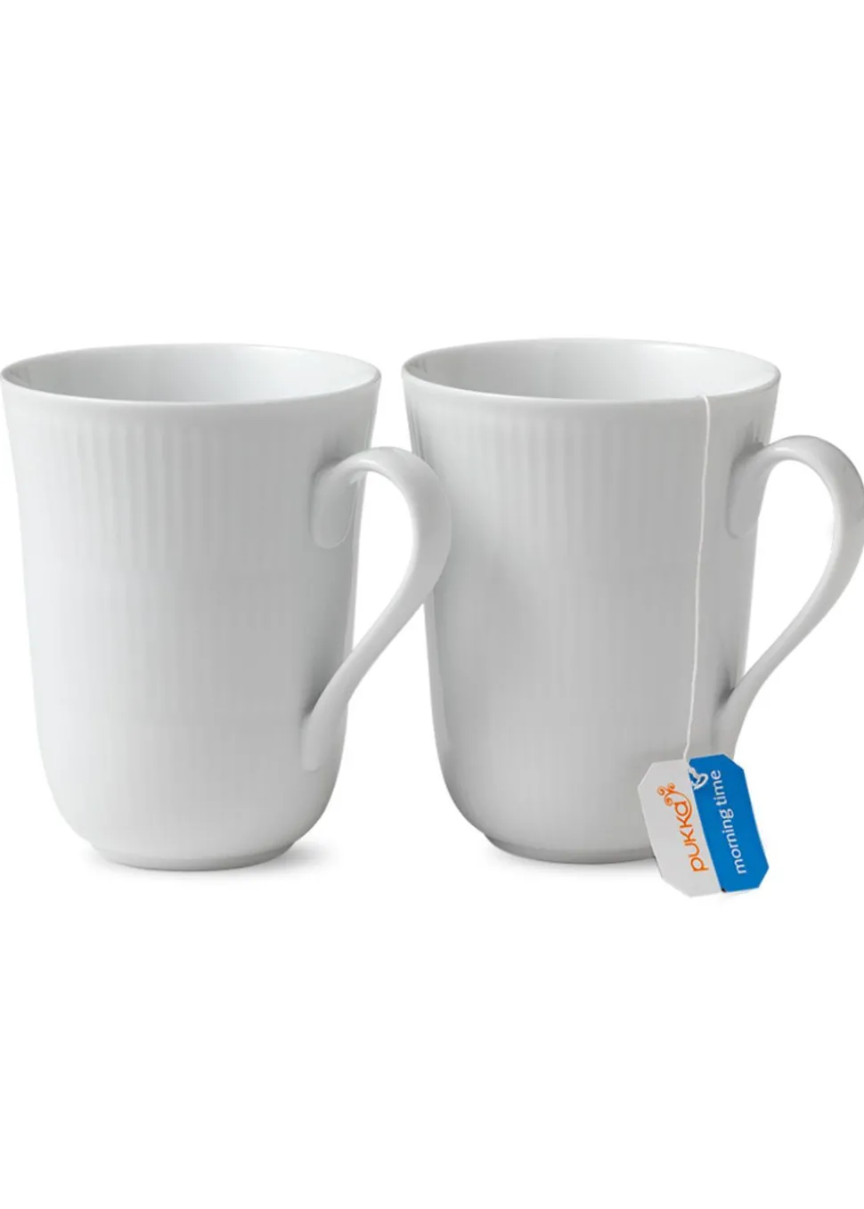 Die Tassen sind von hergestellt und gehören zur Serie „Weiß Gerippt“. Die Tassen haben Größen von 26 cl bis 39 cl. Die Tassen sind aus Porzellan gefertigt und halten alle der Spülmaschine und der Mikrowelle stand.
