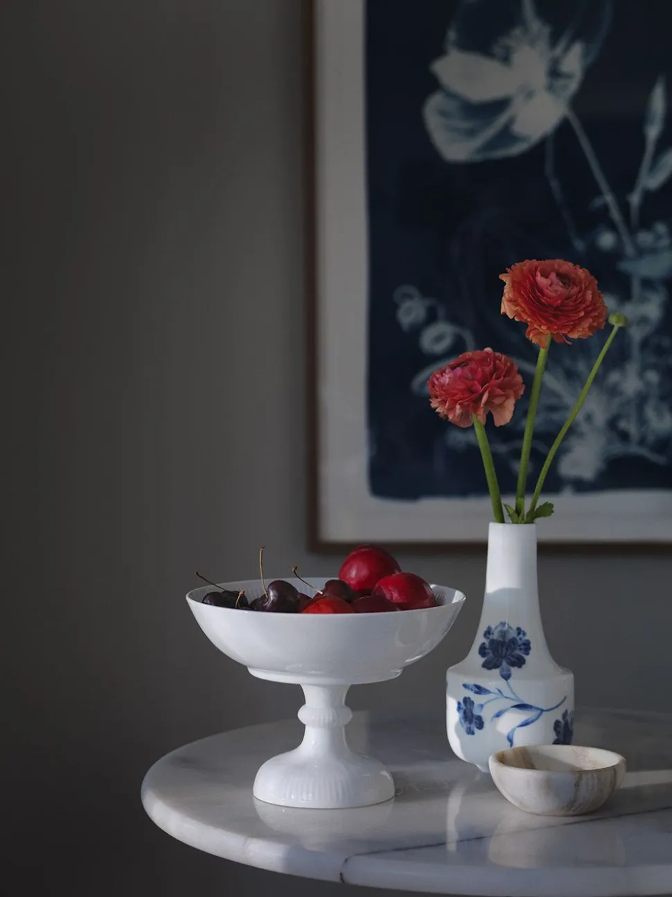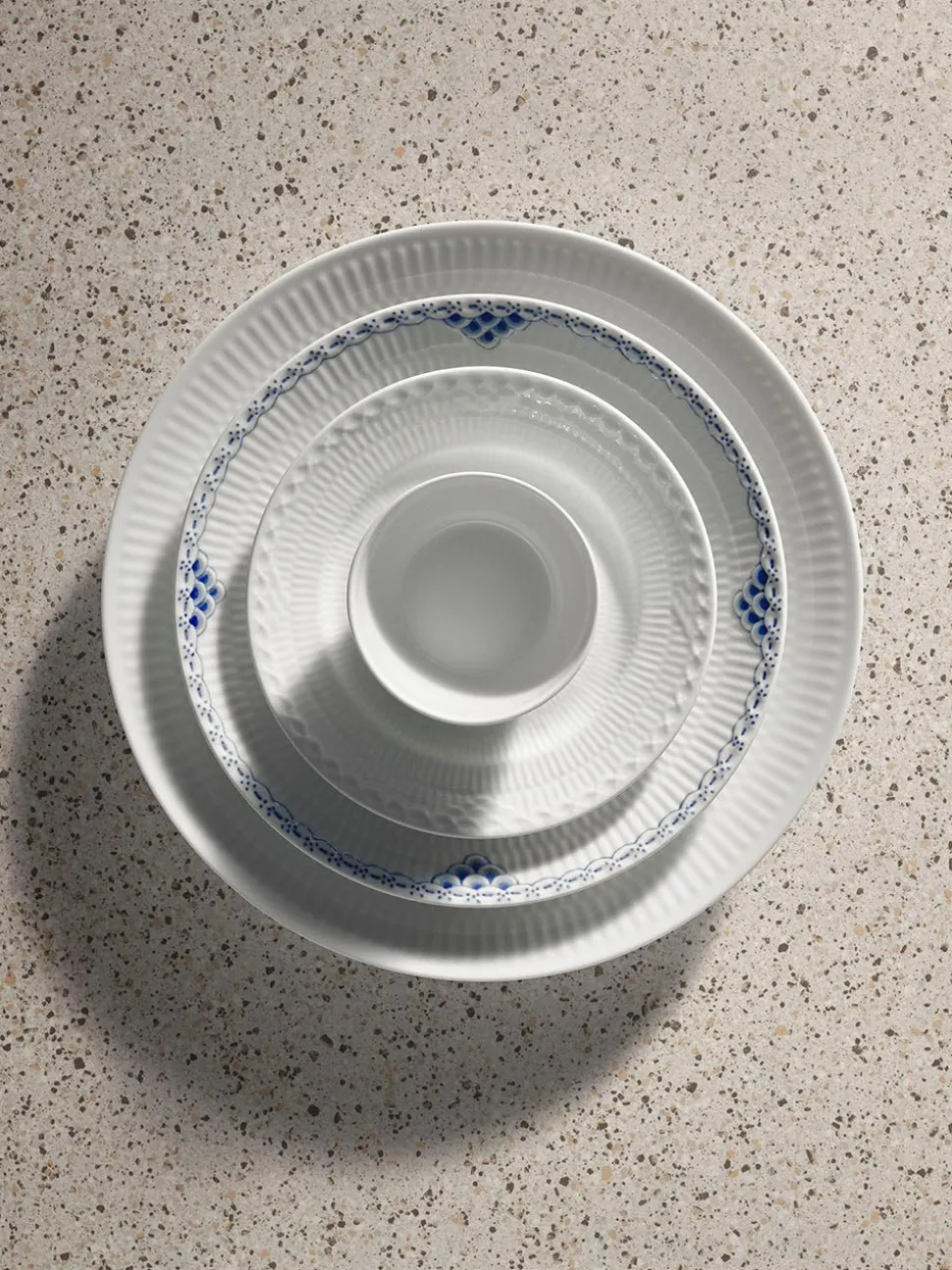 Der Rahmen hat die Form des originalen Musselmalet Riflet-Rahmens, behält aber eine unlackierte, glänzende Oberfläche. Die Schlichtheit und der moderne, minimalistische Look des Sets machen es zu einem Basisset, das mit anderen Porzellansets mit handgemalten Dekoren und schönen Details kombiniert werden kann.