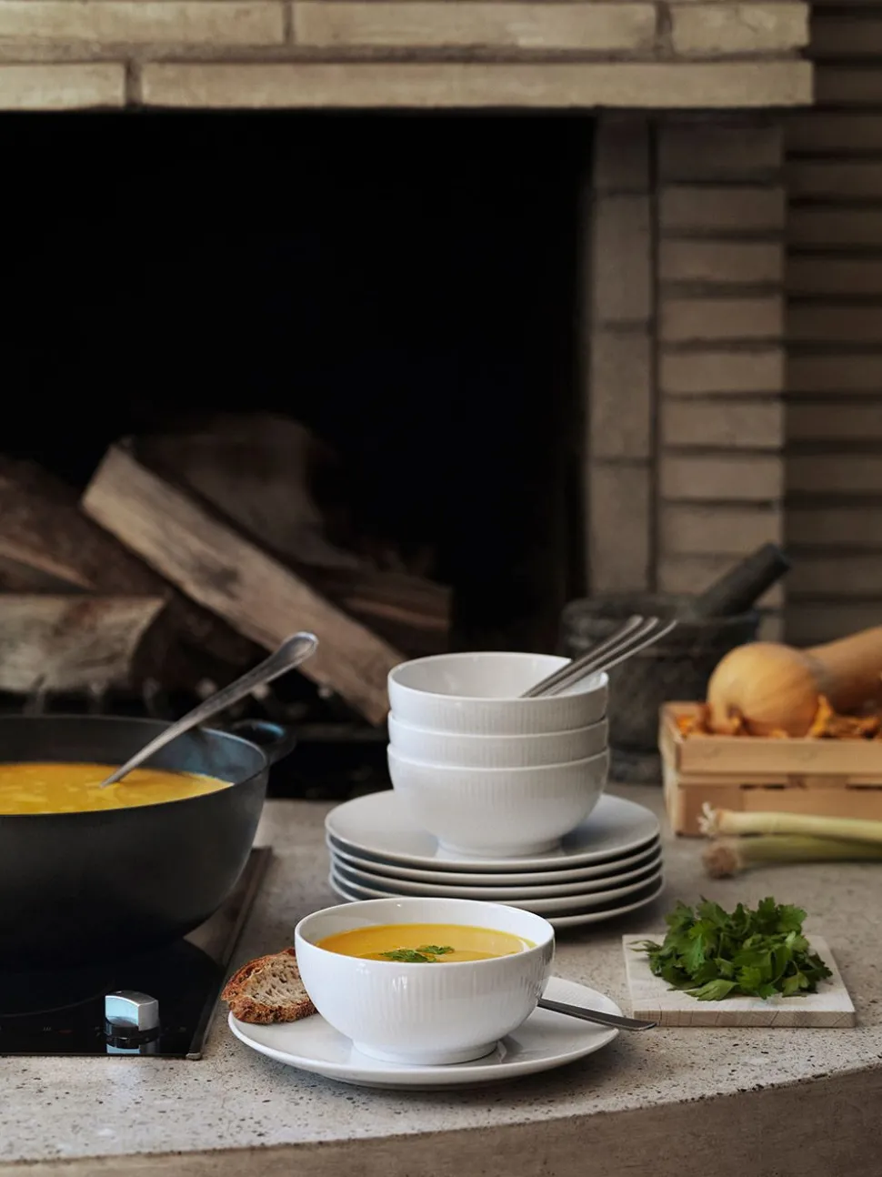 Besteck von Serie, die sich durch ihre handgeschnittenen Riffelungen und ihren klassischen Ausdruck auszeichnet. Die flachen Teller der Serie White Riffle sind in verschiedenen Größen erhältlich, so dass Sie den Tisch für das Mittagessen, das Abendessen und das Dessert decken können.