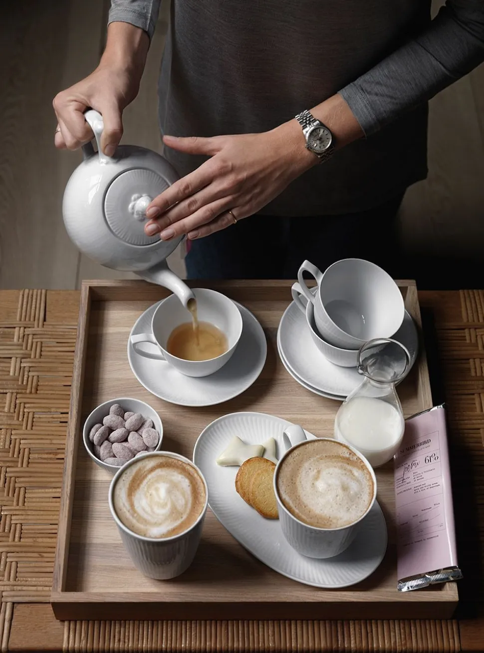 Der Rahmen hat die Form des originalen Musselmalet Riflet-Rahmens, behält aber eine unlackierte, glänzende Oberfläche. Die Schlichtheit und der moderne, minimalistische Look des Sets machen es zu einem Basisset, das mit anderen Porzellansets mit handgemalten Dekoren und schönen Details kombiniert werden kann.