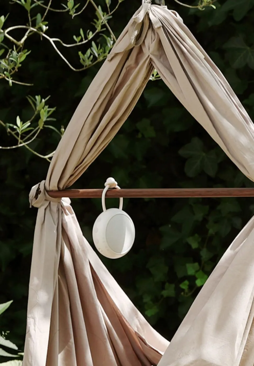 Der White Noise Speaker muss nicht mit einem Smartphone oder einer App verbunden werden, sodass Sie Ihr Telefon frei benutzen können, während Ihr Kind sicher schläft. Der leichte Lautsprecher lässt sich überallhin mitnehmen und kann mit dem integrierten Silikonband an der Querstange der Sling Cradle oder an einem der Gurte an der Cradle aufgehängt werden.
