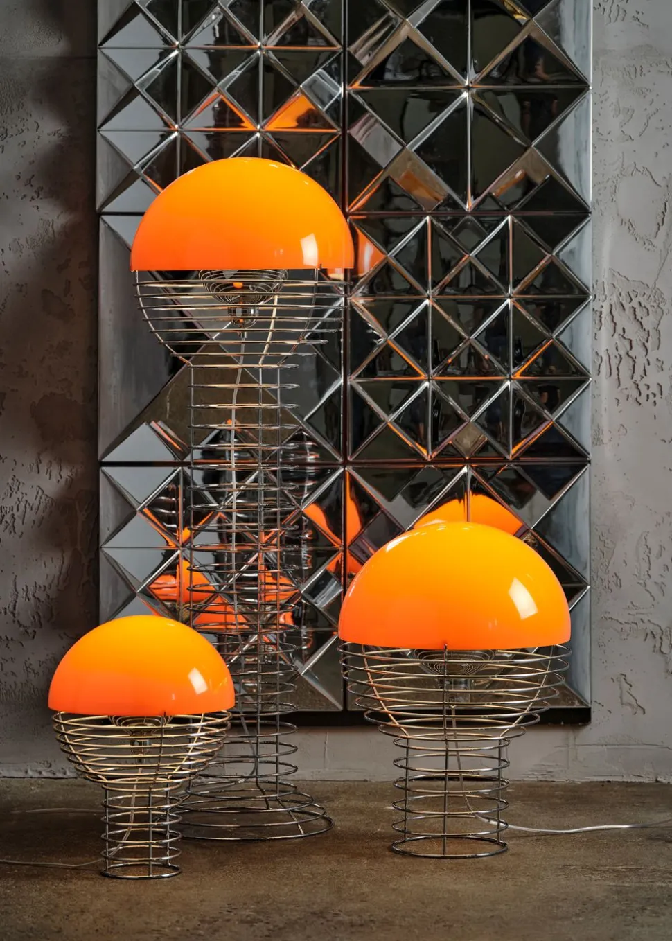 Die Draht-Stehleuchte wurde 1980 von Verner Planton entworfen. Der Rahmen hat eine zylindrische Form, die sich oben in eine Halbkugel ausdehnt. Der Rahmen ist aus verchromtem Stahl und der Lampenschirm aus Kunststoff.