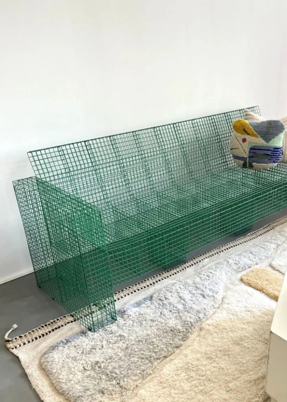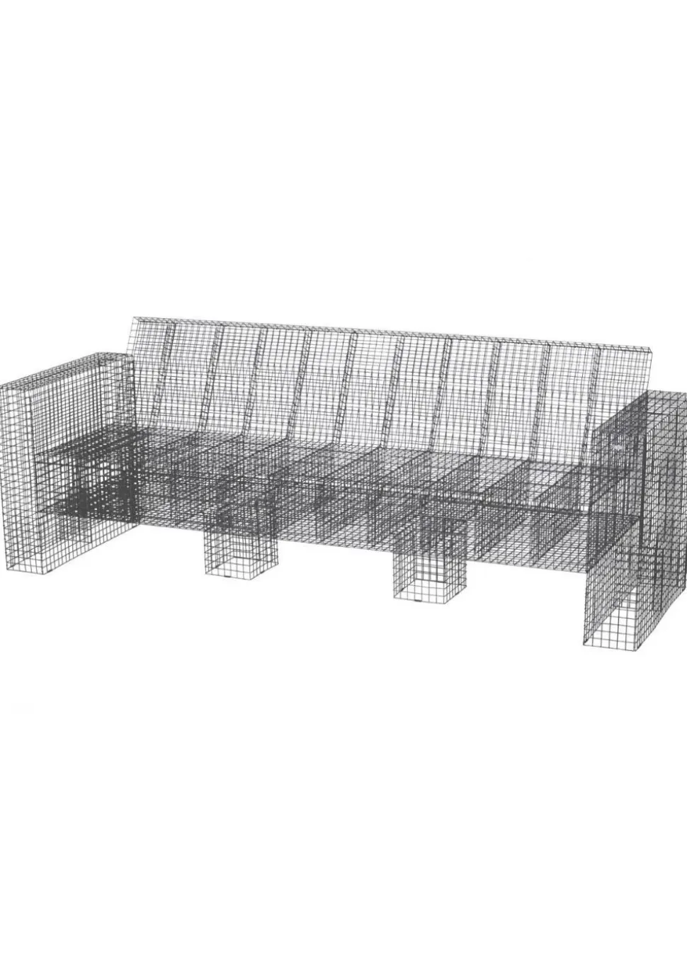 Wire Loungecouch – 3 Pers. von ist ein einzigartiges Loungesofa mit einem minimalistischen und rustikalen Design. Das Loungesofa hat eine geometrische Form, die aus hochwertigem Metalldraht gefertigt ist, was ihm aufgrund des offenen und schlanken Designs ein optisch leichtes Aussehen verleiht.
