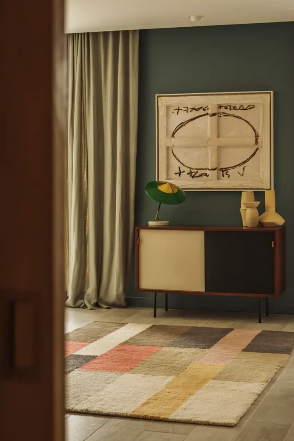 Der Teppich ist sowohl eine weiche Unterlage als auch ein dekoratives Element, das wunderbar mit neutralen Möbeln oder kontrastierenden Farben harmoniert. Er ist ideal für Wohn-, Schlaf- oder Büroräume, wo er Tiefe und eine persönliche Note verleiht, ohne zu dominieren. Kombinieren Sie ihn mit natürlichen Textilien und schlichten Linien für einen eleganten und einladenden Look.