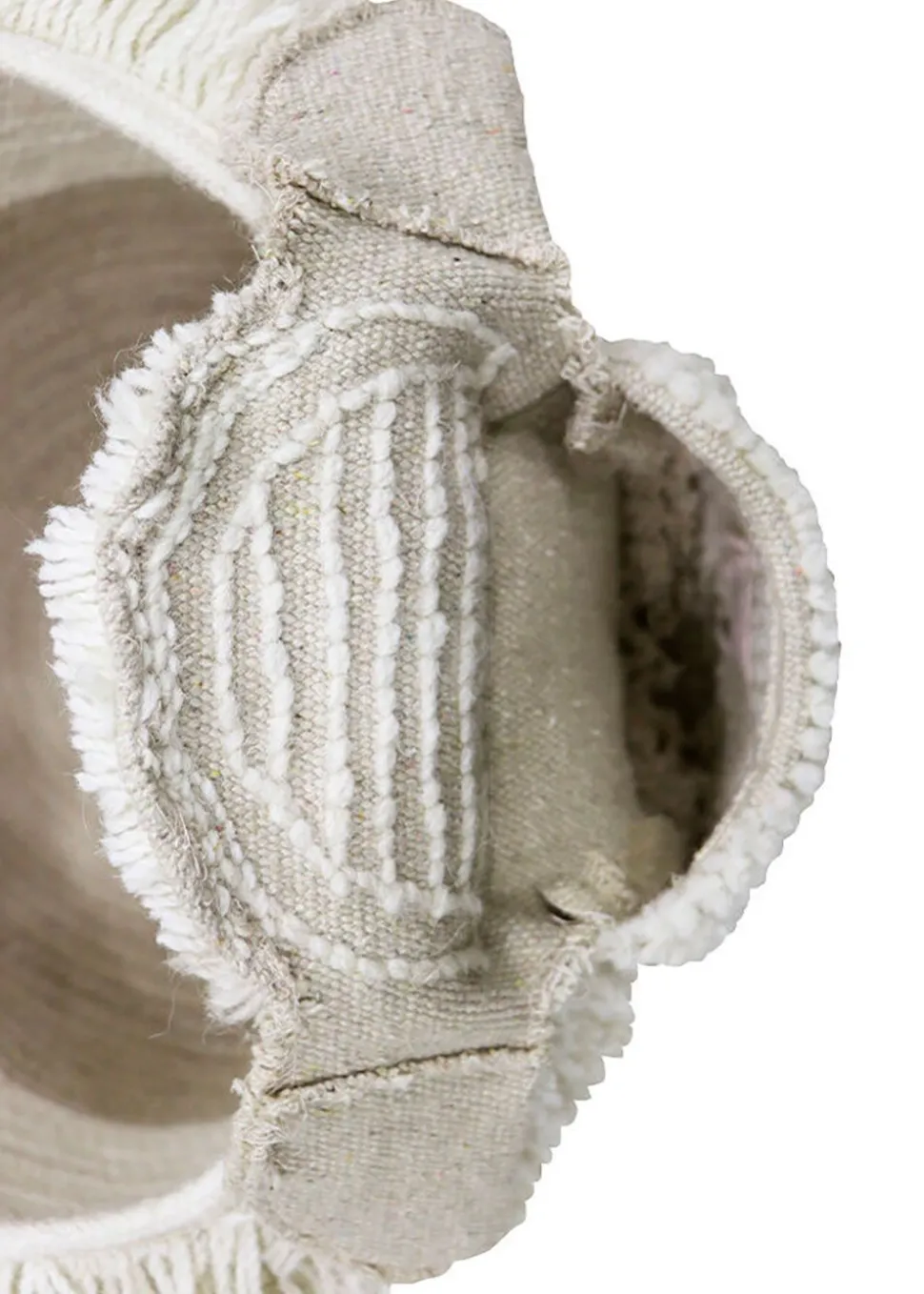 Der Korb hat eine ovale Form und ist aus 100 % Wolle gefertigt. Der Korb ist mit sandsteinfarbenen und schafsweißen Kordeln verziert und seine Ränder sind mit langen, 4 cm langen Fransen eingefasst, die ein Schafsfell simulieren. Der Korb hat eine Tasche in Form eines Schafsgesichts mit aufgestickter Nase auf der Vorderseite. Die beiden Ohren aus Baumwollstoff an der Seite des Korbes vervollständigen den niedlichen Schaf-Look.