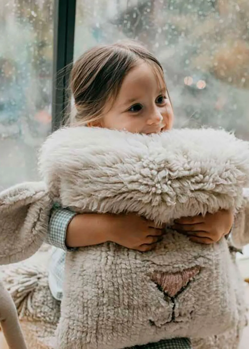 Das Woolable Cushion Pink Nose Sheep von ist ein charmantes Kinderkissen in Form eines niedlichen Schafes. Das Kissen ist eine Kombination aus ungefärbter Wolle, gestickter Nase und getufteten Ohren aus Leinen. Das Kissen hat einen Metallreißverschluss an der Unterkante, mit dem sich die Füllung zum Waschen leicht entfernen lässt.