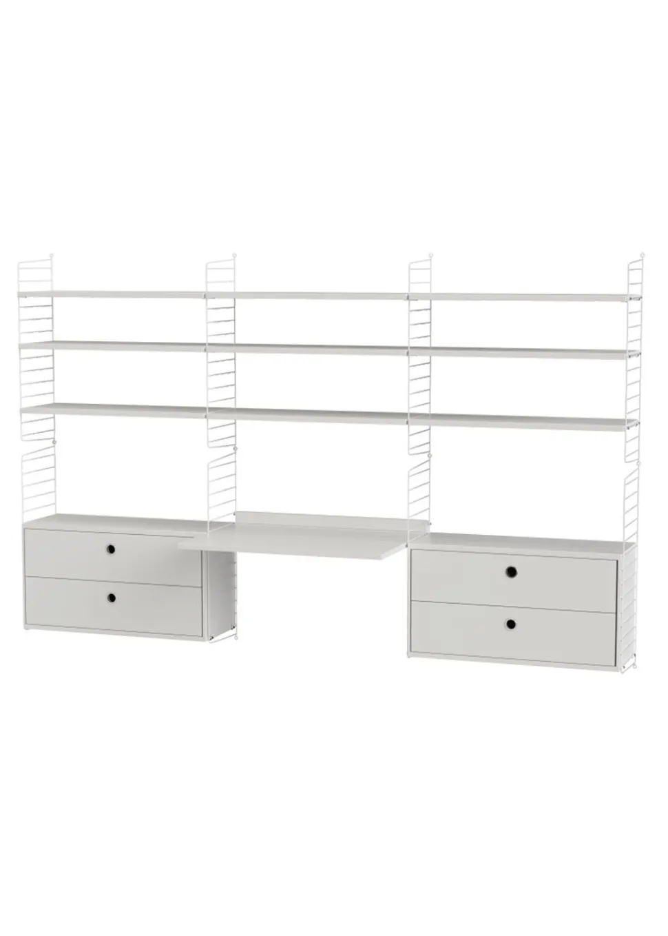 - Bestandteile: 4 x 2er-Pack Wandpaneel h75 x d30 cm | 3 x 3er-Pack Regal b78 x d30 cm | 1 x Arbeitstisch b78 x d58 cm | 2 x Schrank mit zwei Schubladen b78 x d30 x h42 cm.