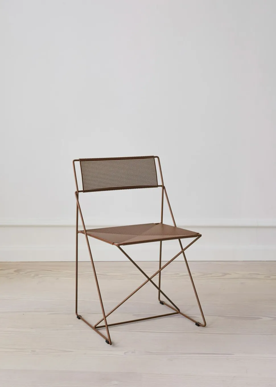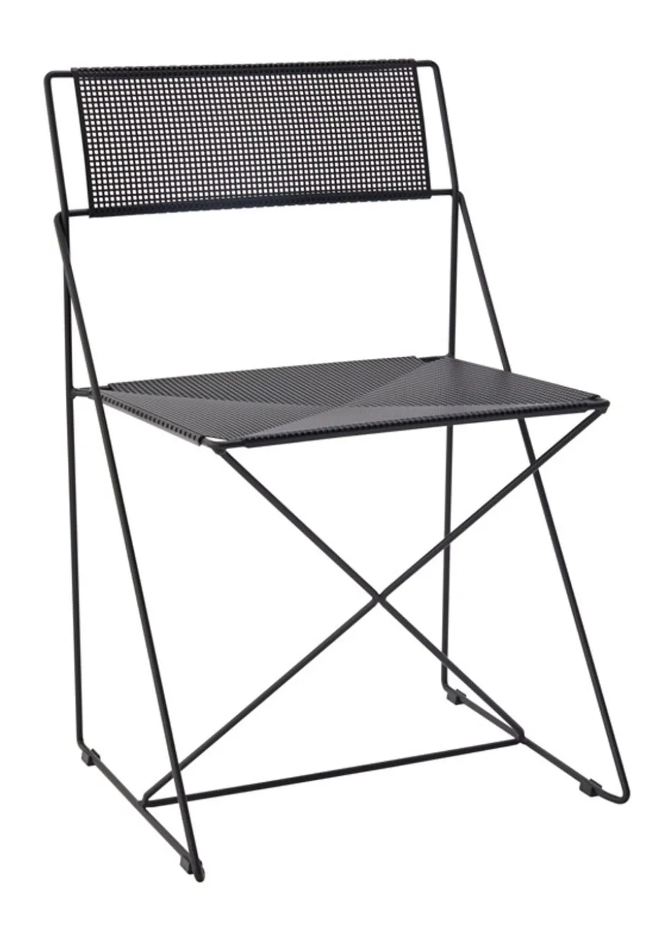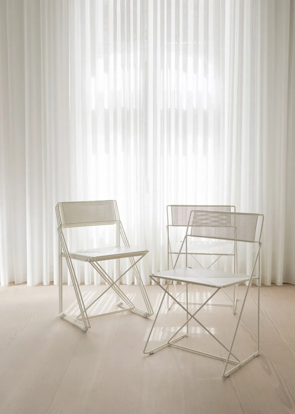Der X-Line Stuhl ist eine Design-Ikone. Der Stuhl wurde 1977 von dem dänischen Architekten Niels Jørgen Haugesen entworfen. Der Name rührt daher, dass die X-Form im Mittelpunkt des Designs steht und dazu beiträgt, die Funktion, Stabilität und Haltbarkeit des Stuhls zu verbessern. Die farbigen Stühle sind pulverbeschichtet und daher für den Außeneinsatz geeignet. Wenn die Stühle gelagert oder transportiert werden müssen, können sie papierdünn 9,5 mm gestapelt werden: 12 Stück auf dem Boden oder 40 Stück auf einem Wagen.