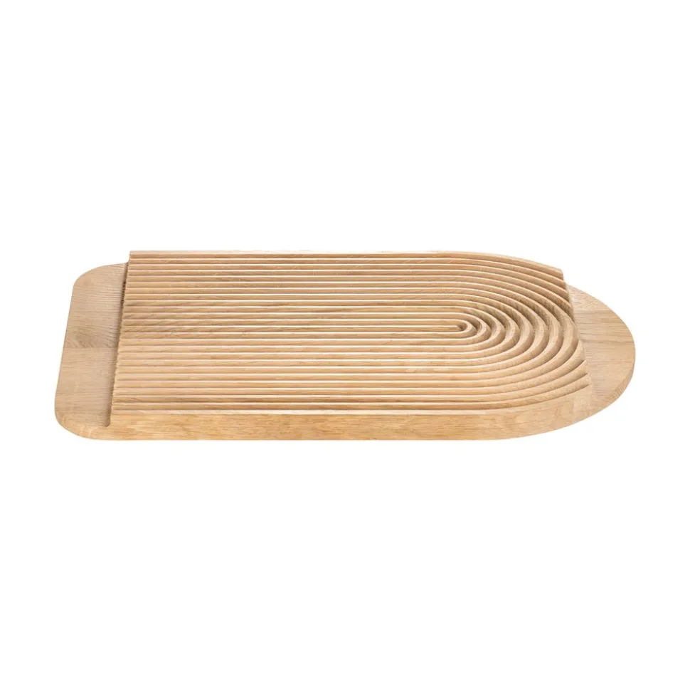 Ein Schneidebrett mit mehreren Funktionen ist sehr praktisch. Auf einer Seite des Schneidebretts befinden sich feine Rillen, so dass die Krümel nicht überall hingelangen, sondern sich in den Rillen sammeln. Wenn man das Schneidebrett umdreht, dient es als elegante Servierplatte.